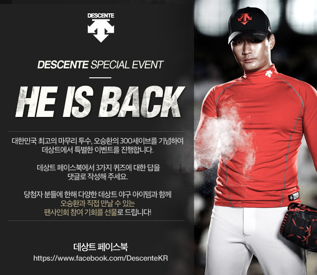 오는 24일부터 열흘 동안 진행되는 온라인 이벤트는 데상트 페이스북(https://www.facebook.com/DescenteKR)에서 응모가 가능하며, 간단한 퀴즈 참여와 오승환 선수를 꼭 만나야 하는 사연을 댓글로 달면 이벤트에 참여할 수 있다.