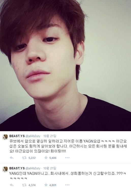 양요섭은 지난 21일 자신의 트위터를 통해 “YANG인데 YAGN아니고...회사 내에서..성희롱하는 거 신고할 수 있죠?”라고 남긴 후, 이어 “큐브에서 앞으로 열심히 일하라고 지어준 이름 YAGN요섭. 야근 요섭은 오늘도 힘차게 살아보려 합니다. 야근하시는 모든 회사원 분들 힘내세요! 야근 요섭이 있잖아요! 파이팅!”라는 글을 게재했다.