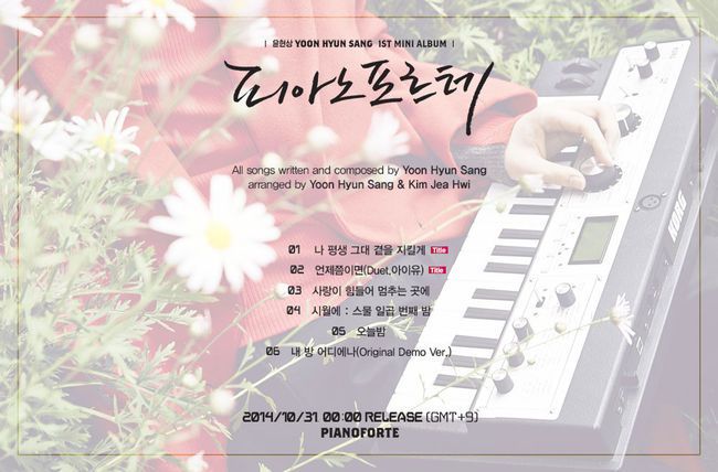 윤현상의 첫 번째 미니앨범 ‘피아노포르테’는 31일 0시 멜론, 엠넷닷컴, 소리바다, 올레뮤직, 네이버뮤직 등 국내 주요 온라인 음악사이트를 통해 일제히 공개된다.