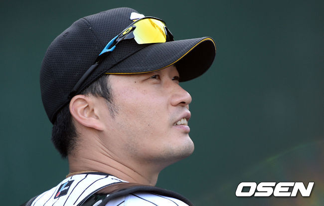 훈련을 마친 한신 오승환이 취재진과 이야기를 나누고 있다.