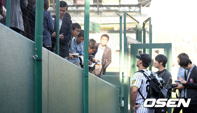 훈련을 마친 한신 오승환이 취재진과 이야기를 나누고 있다.