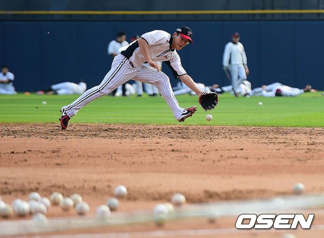 24일 오후 서울 잠실구장에서 열리는 2014 한국야쿠르트 세븐 프로야구 포스트시즌 준플레이오프 3차전 LG 트윈스와 NC 다이노스의 경기 시작전 문선재가 수비 훈련을 하고 있다.