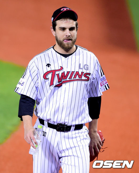 24일 오후 서울 잠실구장에서 열린 2014 한국야쿠르트 세븐 프로야구 포스트시즌 준플레이오프 3차전 LG 트윈스와 NC 다이노스의 경기, 경기에 앞서 LG 리오단이 더그아웃으로 향하고 있다.