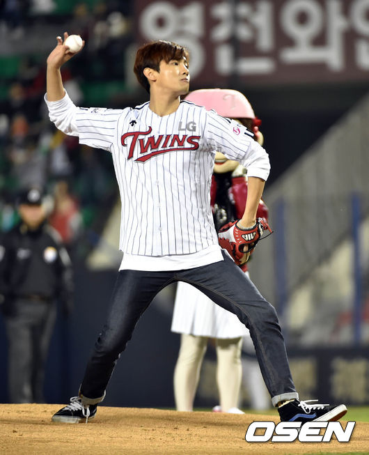 24일 오후 서울 잠실구장에서 열리는 2014 한국야쿠르트 세븐 프로야구 포스트시즌 준플레이오프 3차전 LG 트윈스와 NC 다이노스의 경기에 앞서 동방신기의 최강창민이 멋진 폼으로 시구를 하고 있다.