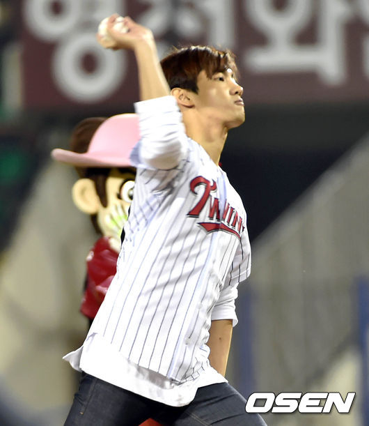 24일 오후 서울 잠실구장에서 열리는 2014 한국야쿠르트 세븐 프로야구 포스트시즌 준플레이오프 3차전 LG 트윈스와 NC 다이노스의 경기에 앞서 동방신기의 최강창민이 멋진 폼으로 시구를 하고 있다.
