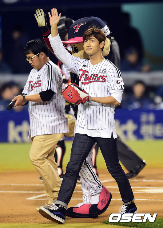 24일 오후 서울 잠실구장에서 열린 2014 한국야쿠르트 세븐 프로야구 포스트시즌 준플레이오프 3차전 LG 트윈스와 NC 다이노스의 경기 시작전 최강창민이 시구를 마치고 관중들에게 손을 흔들고 있다.