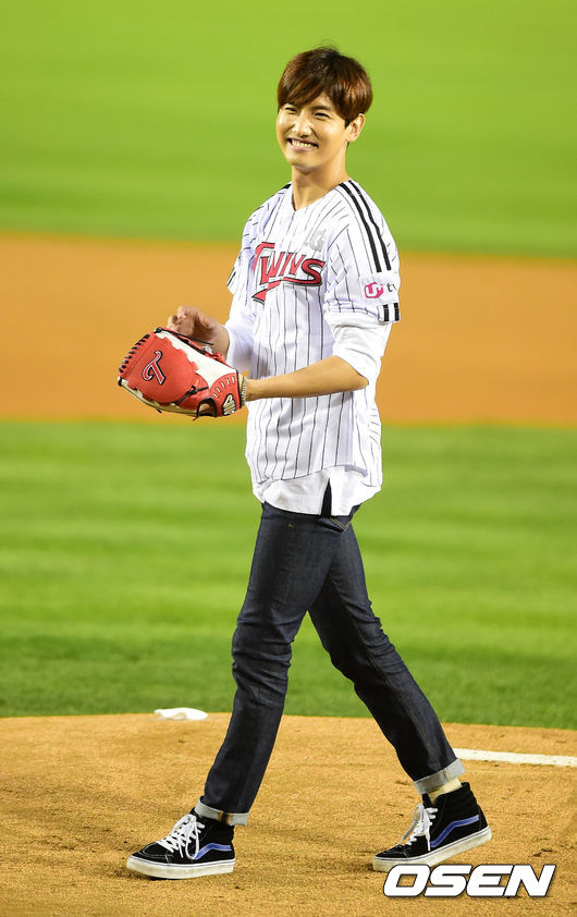 24일 오후 서울 잠실구장에서 열린 2014 한국야쿠르트 세븐 프로야구 포스트시즌 준플레이오프 3차전 LG 트윈스와 NC 다이노스의 경기, 경기에 앞서 가수 동방신기 최강창민이 시구를 마치며 미소짓고 있다.