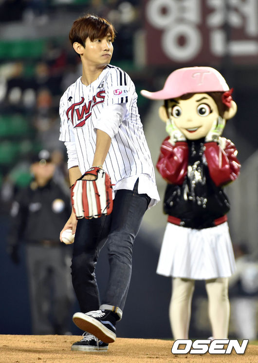 24일 오후 서울 잠실구장에서 열리는 2014 한국야쿠르트 세븐 프로야구 포스트시즌 준플레이오프 3차전 LG 트윈스와 NC 다이노스의 경기에 앞서 동방신기의 최강창민이 멋진 폼으로 시구를 하고 있다.
