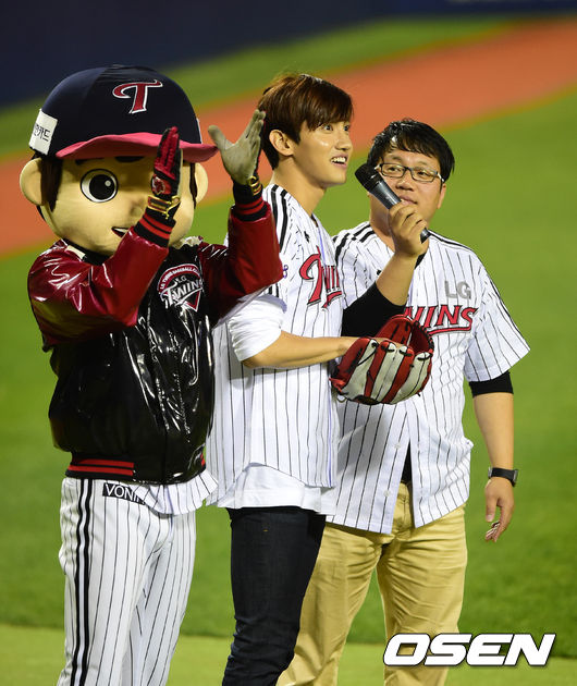24일 오후 서울 잠실구장에서 열린 2014 한국야쿠르트 세븐 프로야구 포스트시즌 준플레이오프 3차전 LG 트윈스와 NC 다이노스의 경기, 경기에 앞서 시구자로 나선 가수 동방신기 최강창민이 팬들에 인사를 하고 있다.