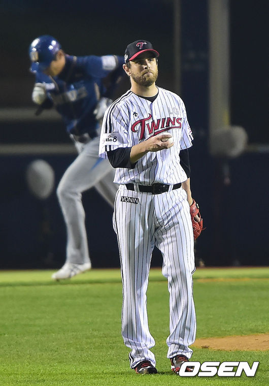 24일 오후 서울 잠실구장에서 열린 '2014 한국야쿠르트 세븐 프로야구' 포스트시즌 준플레이오프 3차전 LG 트윈스와 NC 다이노스의 경기, 1회초 1사 LG 리오단이 NC 김종호에게 볼넷을 허용한 뒤 아쉬워하고 있다. 반격이냐, 마침표냐. 두 외국인 투수들에게 양 팀의 운명이 달렸다. NC와 LG의 준플레이오프 3차전은 이번 시리즈 처음으로 외국인 투수들이 선발 대결이다. NC는 찰리 쉬렉(29), LG는 코리 리오단(28)을 각각 3차전 선발투수로 예고했다. NC는 반격의 1승을 노리고, LG는 3연승으로 시리즈 스윕을 바라본다. NC 찰리는 실질적인 팀의 에이스. 지난해 29경기에서 189이닝을 던지며 11승7패 평균자책점 2.48로 이 부문 1위에 올라 재계약에 성공한 찰리는 2년차가 된 올해도 28경기에서 165⅓이닝을 소화하며 12승8패 평균자책점 3.81로 2년 연속 두 자릿수 승수를 올렸다. LG 리오단은 한국프로야구 데뷔 첫 해 적응기를 거쳐 연착륙했다. 28경기에서 168이닝을 던진 그는 9승10패 평균자책점 3.96으로 준수한 성적을 냈다. 비록 두 자릿수 승수에는 도달하지 못했지만, 팀 내 최다 16차례 퀄리티 스타트의 꾸준함으로 안정감을 자랑했다. / youngrae@osen.co.kr