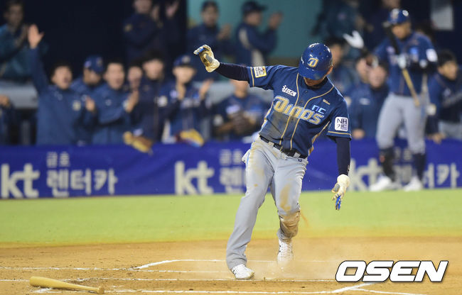 24일 오후 서울 잠실구장에서 열린 2014 한국야쿠르트 세븐 프로야구 포스트시즌 준플레이오프 3차전 LG 트윈스와 NC 다이노스의 경기 1회초 2사 1루 테임즈의 중견수 오른쪽 안타 상황, 1루주자 김종호가 홈을 밟고 있다.