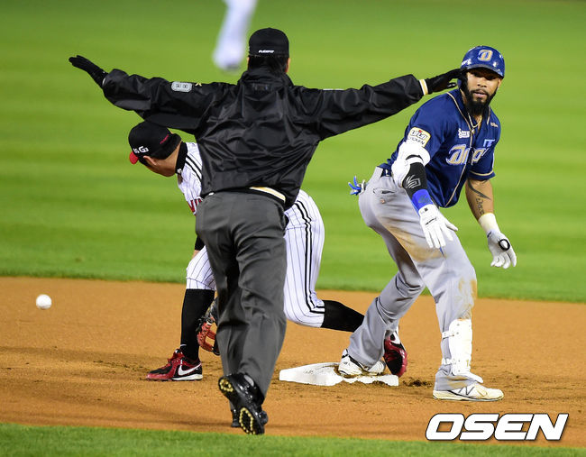 24일 오후 서울 잠실구장에서 열린 2014 한국야쿠르트 세븐 프로야구 포스트시즌 준플레이오프 3차전 LG 트윈스와 NC 다이노스의 경기, 1회초 2사 1루에서 NC 테임즈가 중전안타를 날리고 2루에서 세이프 되고 있다. LG 오지환이 볼을 빠뜨린 사이 1루주자 김종호가 선취득점에 성공.