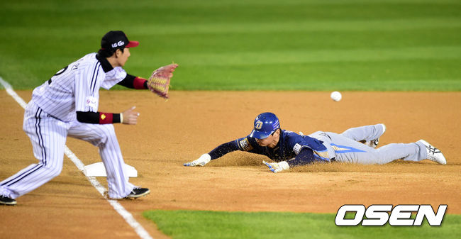 24일 오후 서울 잠실구장에서 열린 2014 한국야쿠르트 세븐 프로야구 포스트시즌 준플레이오프 3차전 LG 트윈스와 NC 다이노스의 경기, 1회초 2사 1루에서 NC 테임즈의 중전안타에 김종호가 3루에서 슬라이딩하며 세이프되고 있다.