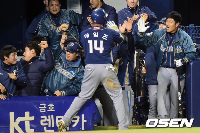 24일 오후 서울 잠실구장에서 열린 2014 한국야쿠르트 세븐 프로야구 포스트시즌 준플레이오프 3차전 LG 트윈스와 NC 다이노스의 경기 1회초 2사 2루 이호준의 1타점 적시타에 홈을 밟은 테임즈가 덕아웃에서 동료들과 하이파이브를 하고 있다.