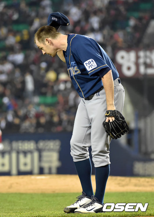 24일 오후 서울 잠실구장에서 열리는 2014 한국야쿠르트 세븐 프로야구 포스트시즌 준플레이오프 3차전 LG 트윈스와 NC 다이노스의 경기 1회말 2사 1루 이병규의 타구를 잘 처리한 김종호에게 찰리가 고개 숙여 인사를 하고 있다.