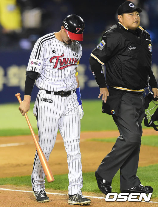 24일 오후 서울 잠실구장에서 열린 2014 한국야쿠르트 세븐 프로야구 포스트시즌 준플레이오프 3차전 LG 트윈스와 NC 다이노스의 경기 1회말 선두타자 정성훈이 찰리의 공에 몸을 맞고 1루로 출루하고 있다.