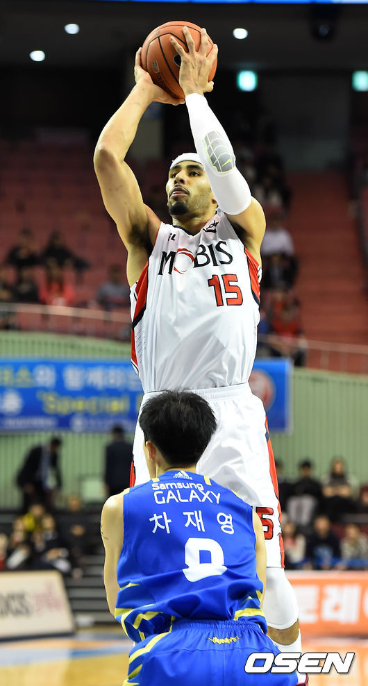 24일 오후 서울 잠실실내체육관에서 열린 '2014-2015 프로농구' 서울 삼성 썬더스와 울산 모비스 피버스의 경기, 1쿼터 모비스 문태영이 점프슛을 날리고 있다.
