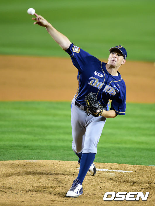 24일 오후 서울 잠실구장에서 열린 2014 한국야쿠르트 세븐 프로야구 포스트시즌 준플레이오프 3차전 LG 트윈스와 NC 다이노스의 경기, 1회말 NC 선발 찰리가 역투하고 있다.