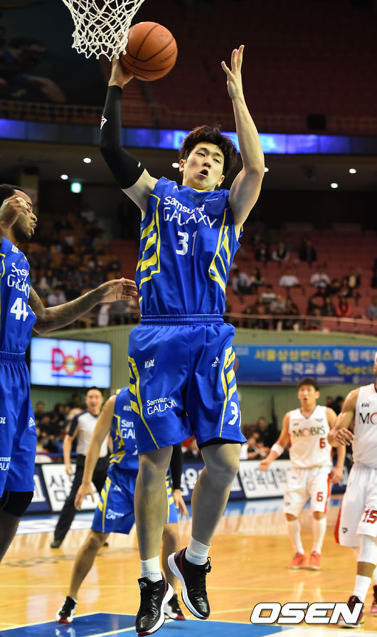 24일 오후 서울 잠실실내체육관에서 열린 '2014-2015 프로농구' 서울 삼성 썬더스와 울산 모비스 피버스의 경기, 1쿼터 삼성 김준일이 리바운드를 하고 있다.
