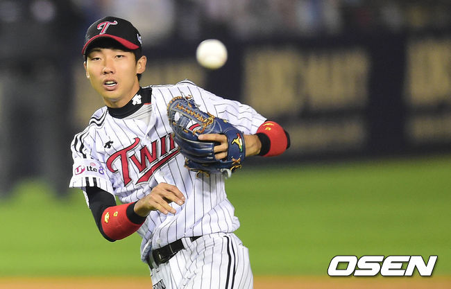 24일 오후 서울 잠실구장에서 열린 2014 한국야쿠르트 세븐 프로야구 포스트시즌 준플레이오프 3차전 LG 트윈스와 NC 다이노스의 경기 2회초 2사 1,3루 김용의가 김종호의 땅볼을 잡아 1루로 송구 하고 있다.