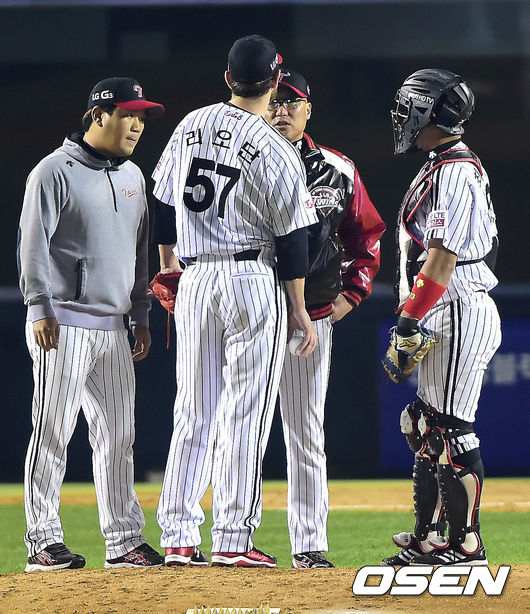 24일 오후 서울 잠실구장에서 열린 '2014 한국야쿠르트 세븐 프로야구' 포스트시즌 준플레이오프 3차전 LG 트윈스와 NC 다이노스의 경기, 2회초 2사 1,3루 LG 강상수 코치가 마운드에 올라 리오단과 이야기를 나누고 있다. 반격이냐, 마침표냐. 두 외국인 투수들에게 양 팀의 운명이 달렸다. NC와 LG의 준플레이오프 3차전은 이번 시리즈 처음으로 외국인 투수들이 선발 대결이다. NC는 찰리 쉬렉(29), LG는 코리 리오단(28)을 각각 3차전 선발투수로 예고했다. NC는 반격의 1승을 노리고, LG는 3연승으로 시리즈 스윕을 바라본다. NC 찰리는 실질적인 팀의 에이스. 지난해 29경기에서 189이닝을 던지며 11승7패 평균자책점 2.48로 이 부문 1위에 올라 재계약에 성공한 찰리는 2년차가 된 올해도 28경기에서 165⅓이닝을 소화하며 12승8패 평균자책점 3.81로 2년 연속 두 자릿수 승수를 올렸다. LG 리오단은 한국프로야구 데뷔 첫 해 적응기를 거쳐 연착륙했다. 28경기에서 168이닝을 던진 그는 9승10패 평균자책점 3.96으로 준수한 성적을 냈다. 비록 두 자릿수 승수에는 도달하지 못했지만, 팀 내 최다 16차례 퀄리티 스타트의 꾸준함으로 안정감을 자랑했다. / youngrae@osen.co.kr