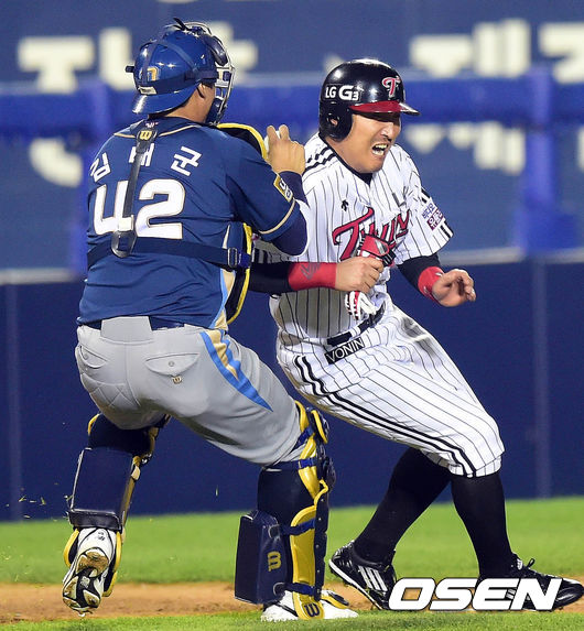 24일 오후 서울 잠실구장에서 열린 2014 한국야쿠르트 세븐 프로야구 포스트시즌 준플레이오프 3차전 LG 트윈스와 NC 다이노스의 경기 2회말 1사 2,3루 최경철의 번트 상황 홈으로 쇄도하던 3루주자 이진영이 협살에 걸려 태그 아웃 당하고 있다.