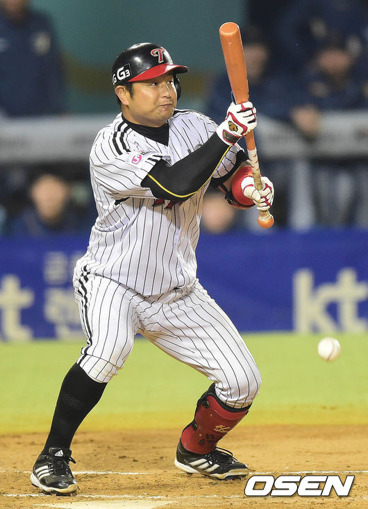 24일 오후 서울 잠실구장에서 열린 2014 한국야쿠르트 세븐 프로야구 포스트시즌 준플레이오프 3차전 LG 트윈스와 NC 다이노스의 경기 2회말 1사 2,3루 최경철이 스퀴즈 번트를 시도하고 있다. 3루주자 이진영은 태그아웃, 최경철은 1루까지 세이프.