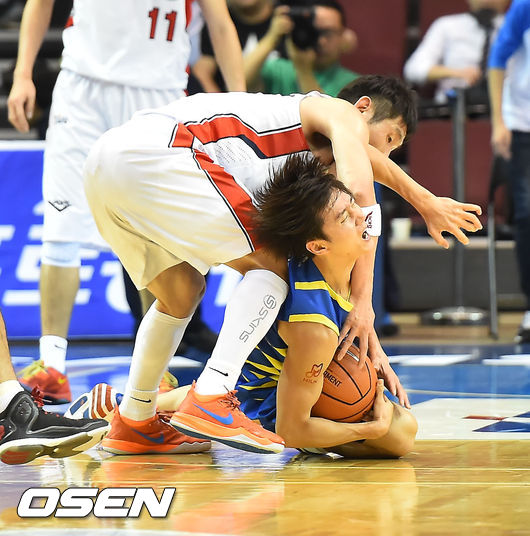 24일 오후 서울 잠실실내체육관에서 열린 '2014-2015 프로농구' 서울 삼성 썬더스와 울산 모비스 피버스의 경기, 2쿼터 모비스 양동근이 삼성 이시준에게 파울을 범하고 있다.