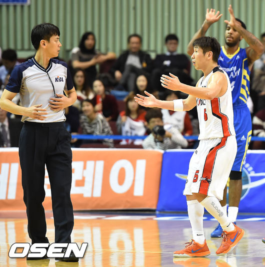24일 오후 서울 잠실실내체육관에서 열린 '2014-2015 프로농구' 서울 삼성 썬더스와 울산 모비스 피버스의 경기, 2쿼터 모비스 양동근이 삼성 이시준을 상대로 파울을 범한 후 항의하고 있다.
