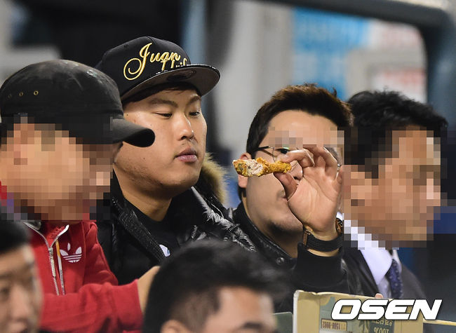 24일 오후 서울 잠실구장에서 열린 2014 한국야쿠르트 세븐 프로야구 포스트시즌 준플레이오프 3차전 LG 트윈스와 NC 다이노스의 경기, LA 다저스 류현진이 치킨을 먹으며 경기를 관전하고 있다.