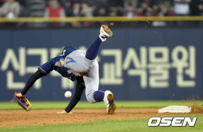 24일 오후 서울 잠실구장에서 열리는 2014 한국야쿠르트 세븐 프로야구 포스트시즌 준플레이오프 3차전 LG 트윈스와 NC 다이노스의 경기, 4회말 1사 1루 최경철의 평범한 타구를 손시헌이 2루에 악송구 ,박민우고 놓치고 있다.