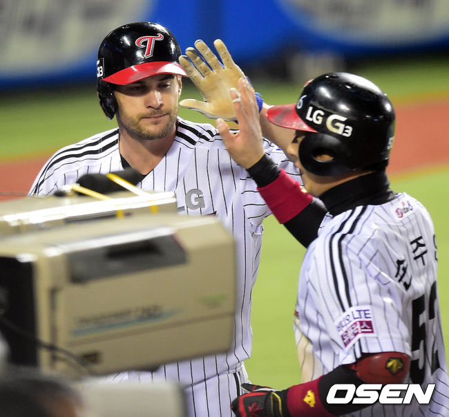 24일 오후 서울 잠실구장에서 열린 2014 한국야쿠르트 세븐 프로야구 포스트시즌 준플레이오프 3차전 LG 트윈스와 NC 다이노스의 경기 4회말 1사 1,3루 손주인의 희생플라이에 홈을 밟은 스나이더가 덕아웃에서 손주인과 하이파이브를 하고 있다.