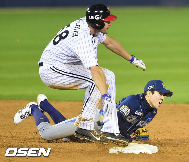 24일 오후 서울 잠실구장에서 열린 2014 한국야쿠르트 세븐 프로야구 포스트시즌 준플레이오프 3차전 LG 트윈스와 NC 다이노스의 경기 4회말 1사 1루 최경철의 내야안타 상황, 유격수의 송구 실책으로 2루수 박민우가 공을 놓치고 있다. 스나이더는 3루까지 진루.