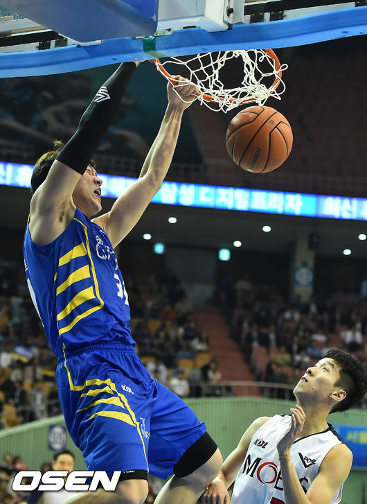 24일 오후 서울 잠실실내체육관에서 열린 '2014-2015 프로농구' 서울 삼성 썬더스와 울산 모비스 피버스의 경기, 3쿼터 삼성 김준일이 투핸드 덩크슛을 성공시키고 있다.