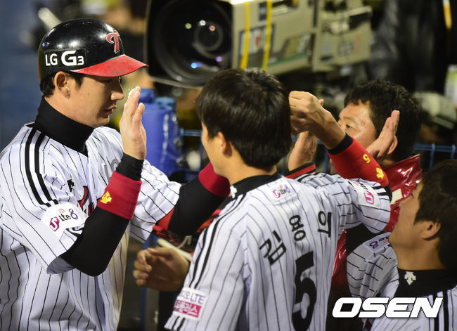 24일 오후 서울 잠실구장에서 열린 2014 한국야쿠르트 세븐 프로야구 포스트시즌 준플레이오프 3차전 LG 트윈스와 NC 다이노스의 경기, 4회말 1사 1,3루에서 LG 손주인의 희생플라이에 스나이더가 태그업, 동점에 성공하며 손주인이 더그아웃에서 동료선수들과 하이파이브를 하고 있다.