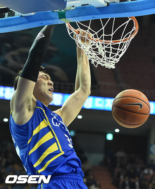 24일 오후 서울 잠실실내체육관에서 열린 '2014-2015 프로농구' 서울 삼성 썬더스와 울산 모비스 피버스의 경기, 3쿼터 삼성 김준일이 투핸드 덩크슛을 성공시키고 있다.