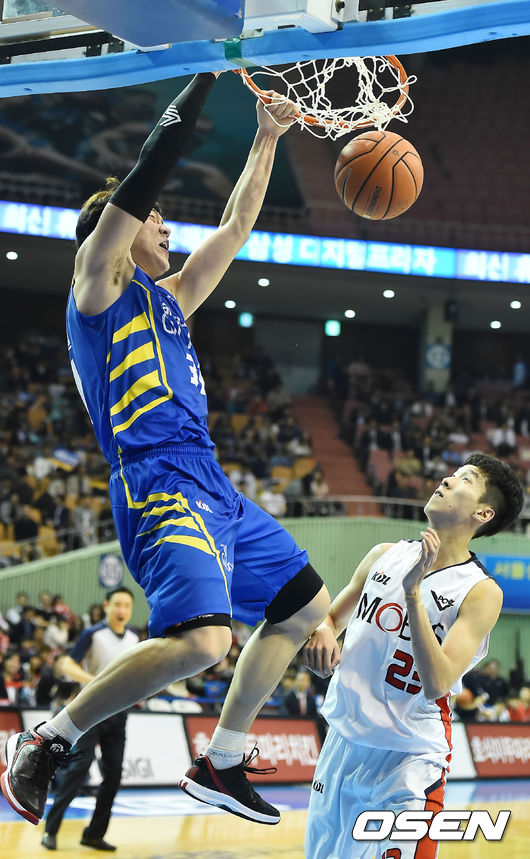 24일 오후 서울 잠실실내체육관에서 열린 '2014-2015 프로농구' 서울 삼성 썬더스와 울산 모비스 피버스의 경기, 3쿼터 삼성 김준일이 투핸드 덩크슛을 성공시키고 있다.