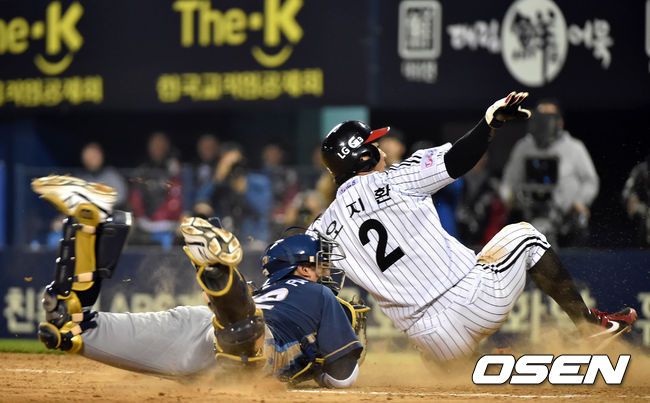 24일 오후 서울 잠실구장에서 열리는 2014 한국야쿠르트 세븐 프로야구 포스트시즌 준플레이오프 3차전 LG 트윈스와 NC 다이노스의 경기, 5회말 무사 1,3루 이병규의 중견수 풀라이때 3루주자 오지환이 홈을 파고들었지만 아웃되고 있다.