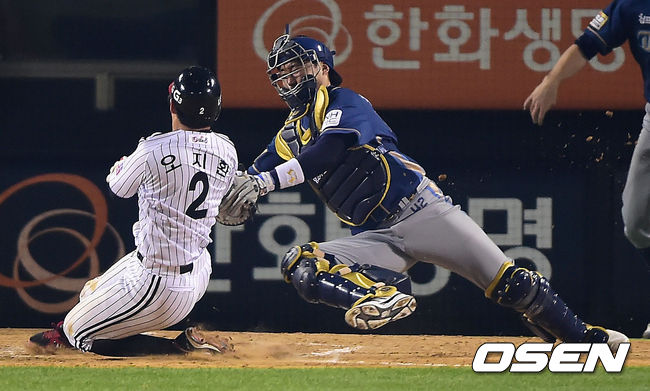 24일 오후 서울 잠실구장에서 열린 '2014 한국야쿠르트 세븐 프로야구' 포스트시즌 준플레이오프 3차전 LG 트윈스와 NC 다이노스의 경기, 5회말 무사 1,3루 LG 오지환이 이병규의 중견수 희생플라이때 홈으로 쇄도하다 아웃당하고 있다. 반격이냐, 마침표냐. 두 외국인 투수들에게 양 팀의 운명이 달렸다. NC와 LG의 준플레이오프 3차전은 이번 시리즈 처음으로 외국인 투수들이 선발 대결이다. NC는 찰리 쉬렉(29), LG는 코리 리오단(28)을 각각 3차전 선발투수로 예고했다. NC는 반격의 1승을 노리고, LG는 3연승으로 시리즈 스윕을 바라본다. NC 찰리는 실질적인 팀의 에이스. 지난해 29경기에서 189이닝을 던지며 11승7패 평균자책점 2.48로 이 부문 1위에 올라 재계약에 성공한 찰리는 2년차가 된 올해도 28경기에서 165⅓이닝을 소화하며 12승8패 평균자책점 3.81로 2년 연속 두 자릿수 승수를 올렸다. LG 리오단은 한국프로야구 데뷔 첫 해 적응기를 거쳐 연착륙했다. 28경기에서 168이닝을 던진 그는 9승10패 평균자책점 3.96으로 준수한 성적을 냈다. 비록 두 자릿수 승수에는 도달하지 못했지만, 팀 내 최다 16차례 퀄리티 스타트의 꾸준함으로 안정감을 자랑했다. / youngrae@osen.co.kr