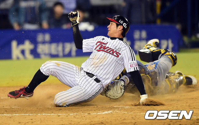 24일 오후 서울 잠실구장에서 열린 2014 한국야쿠르트 세븐 프로야구 포스트시즌 준플레이오프 3차전 LG 트윈스와 NC 다이노스의 경기 5회말 무사 1,3루 이병규의 뜬공에 홈으로 쇄도하던 3루주자 오지환이 홈에서 태그아웃 당하고 있다.