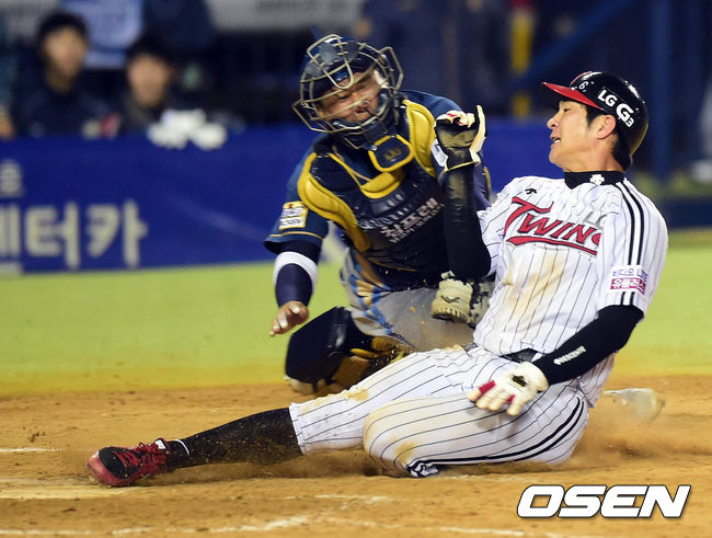 24일 오후 서울 잠실구장에서 열린 2014 한국야쿠르트 세븐 프로야구 포스트시즌 준플레이오프 3차전 LG 트윈스와 NC 다이노스의 경기 5회말 무사 1,3루 이병규의 뜬공에 홈으로 쇄도하던 3루주자 오지환이 홈에서 태그아웃 당하고 있다.