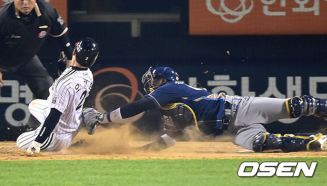 24일 오후 서울 잠실구장에서 열린 '2014 한국야쿠르트 세븐 프로야구' 포스트시즌 준플레이오프 3차전 LG 트윈스와 NC 다이노스의 경기, 5회말 무사 1,3루 LG 3루주자 오지환이 이병규의 중견수 희생플라이때 홈으로 쇄도하다 아웃당하고 있다. 반격이냐, 마침표냐. 두 외국인 투수들에게 양 팀의 운명이 달렸다. NC와 LG의 준플레이오프 3차전은 이번 시리즈 처음으로 외국인 투수들이 선발 대결이다. NC는 찰리 쉬렉(29), LG는 코리 리오단(28)을 각각 3차전 선발투수로 예고했다. NC는 반격의 1승을 노리고, LG는 3연승으로 시리즈 스윕을 바라본다. NC 찰리는 실질적인 팀의 에이스. 지난해 29경기에서 189이닝을 던지며 11승7패 평균자책점 2.48로 이 부문 1위에 올라 재계약에 성공한 찰리는 2년차가 된 올해도 28경기에서 165⅓이닝을 소화하며 12승8패 평균자책점 3.81로 2년 연속 두 자릿수 승수를 올렸다. LG 리오단은 한국프로야구 데뷔 첫 해 적응기를 거쳐 연착륙했다. 28경기에서 168이닝을 던진 그는 9승10패 평균자책점 3.96으로 준수한 성적을 냈다. 비록 두 자릿수 승수에는 도달하지 못했지만, 팀 내 최다 16차례 퀄리티 스타트의 꾸준함으로 안정감을 자랑했다. / youngrae@osen.co.kr