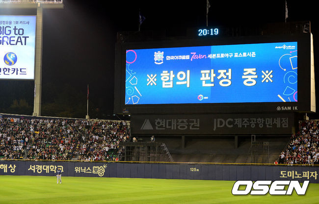 24일 오후 서울 잠실구장에서 열린 2014 한국야쿠르트 세븐 프로야구 포스트시즌 준플레이오프 3차전 LG 트윈스와 NC 다이노스의 경기 5회말 무사 1,3루 이병규의 외야플리이 상황, 홈으로 쇄도한 3루주자 오지환의 아웃 여부에대해 합의판정이 진행되고 있다.
