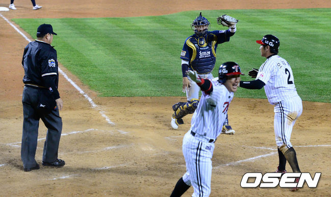 24일 오후 서울 잠실구장에서 열린 2014 한국야쿠르트 세븐 프로야구 포스트시즌 준플레이오프 3차전 LG 트윈스와 NC 다이노스의 경기, 5회말 무사 1,3루에서 LG 오지환이 이병규의 중견수 플라이에 태그업, NC 김태군에 태그아웃당하며 판정에 불만을 나타내고 있다.
