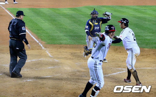 24일 오후 서울 잠실구장에서 열린 2014 한국야쿠르트 세븐 프로야구 포스트시즌 준플레이오프 3차전 LG 트윈스와 NC 다이노스의 경기, 5회말 무사 1,3루에서 LG 3루주자 오지환이 이병규의 중견수 플라이에 태그업, NC 김태군에 태그아웃당하자 판정에 불만을 나타내고 있다.