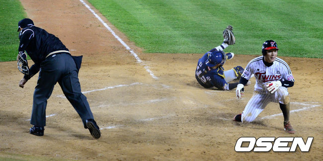 24일 오후 서울 잠실구장에서 열린 2014 한국야쿠르트 세븐 프로야구 포스트시즌 준플레이오프 3차전 LG 트윈스와 NC 다이노스의 경기, 5회말 무사 1,3루에서 LG 오지환이 이병규의 중견수 플라이에 태그업, NC 김태군에 태그아웃당하고 있다.