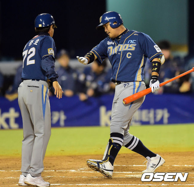 24일 오후 서울 잠실구장에서 열린 2014 한국야쿠르트 세븐 프로야구 포스트시즌 준플레이오프 3차전 LG 트윈스와 NC 다이노스의 경기 6회초 1사 이호준이 솔로포를 치고 전준호 코치와 하이파이브를 하고 있다.