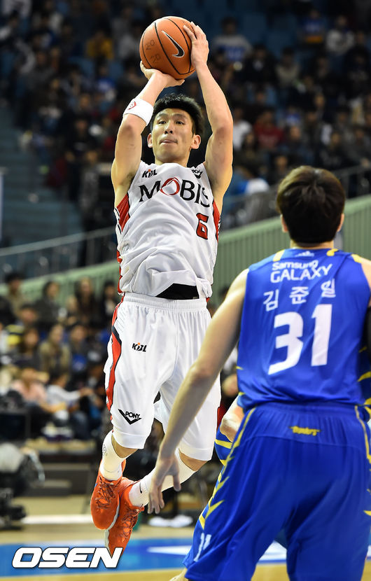 24일 오후 서울 잠실실내체육관에서 열린 '2014-2015 프로농구' 서울 삼성 썬더스와 울산 모비스 피버스의 경기, 4쿼터 모비스 양동근이 점프슛을 날리고 있다.
