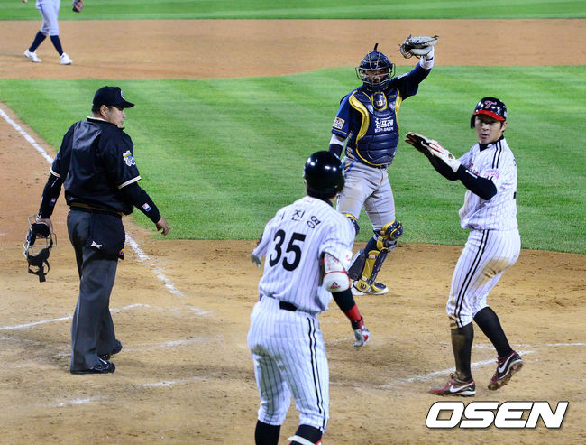 24일 오후 서울 잠실구장에서 열린 2014 한국야쿠르트 세븐 프로야구 포스트시즌 준플레이오프 3차전 LG 트윈스와 NC 다이노스의 경기, 5회말 무사 1,3루에서 LG 오지환이 이병규의 중견수 플라이에 태그업, NC 김태군에 태그아웃당하며 판정에 아쉬워하고 있다. 합의판정 결과 아웃.