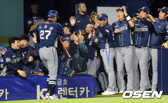 24일 오후 서울 잠실구장에서 열린 2014 한국야쿠르트 세븐 프로야구 포스트시즌 준플레이오프 3차전 LG 트윈스와 NC 다이노스의 경기 6회초 1사 이호준이 솔로홈런을 치고 덕아웃에서 동료들과 하이파이브를 하고 있다.